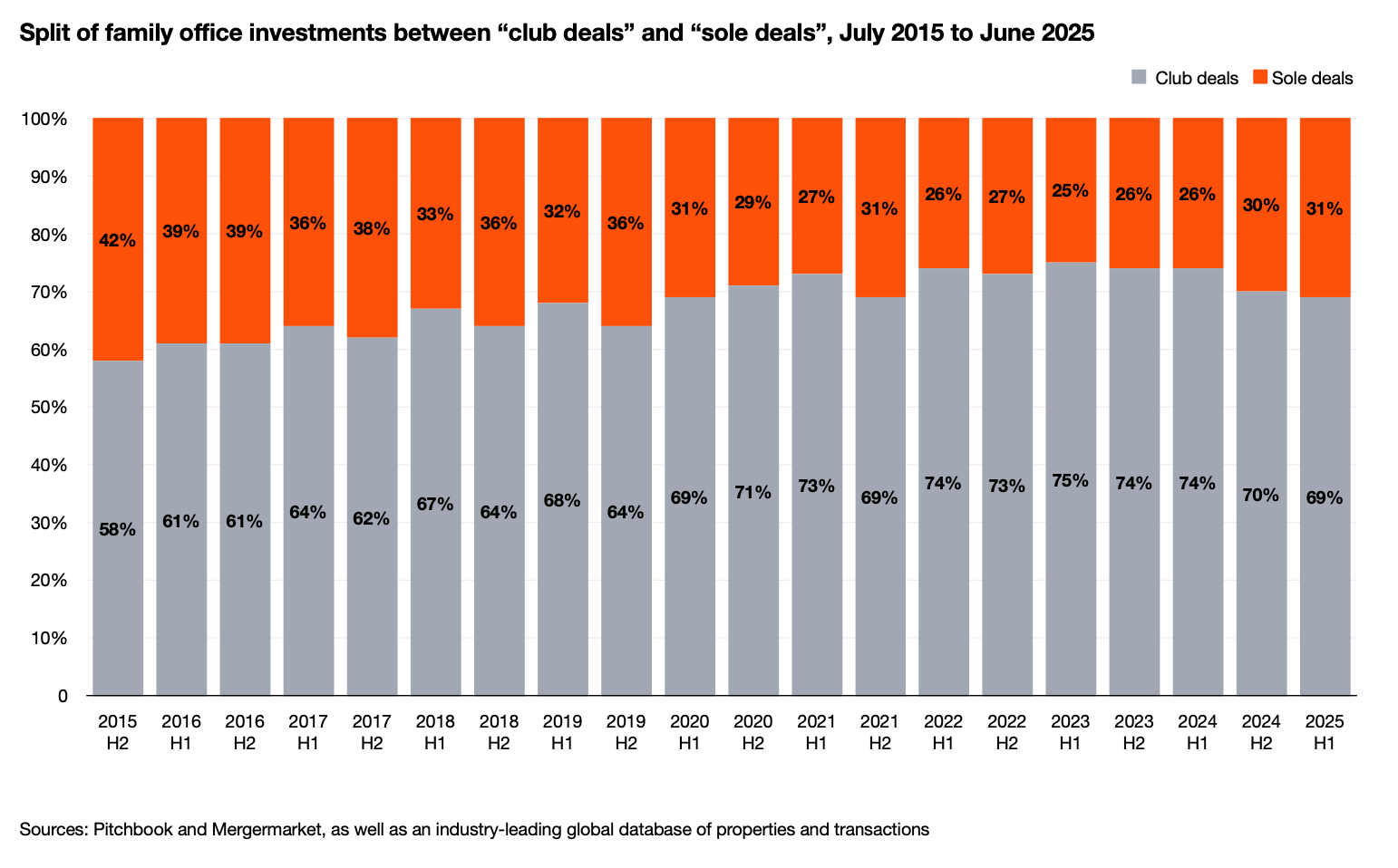 69% of investments are ‘club deals’ where families invest alongside others, which fits the perception of family offices being wary to go it alone, and as the report says, “underscoring their desire for risk-sharing and resource pooling”.