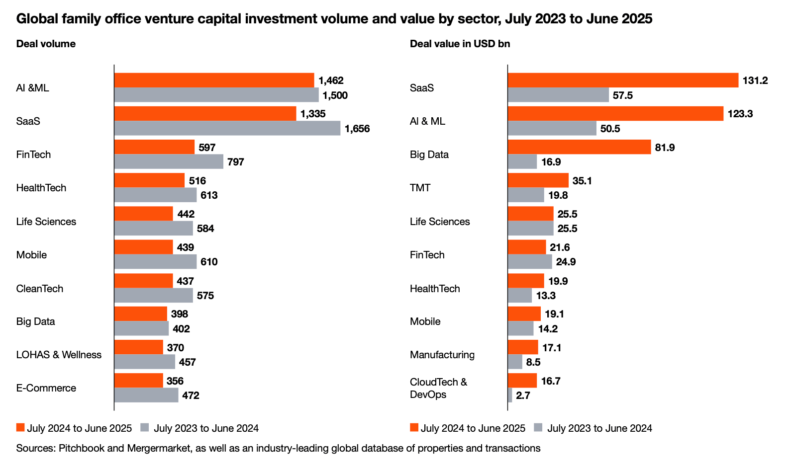 Software ranked second in deal volume (after commercial services) but topped both deal value and growth, signaling tech’s enduring pull for family capital.
